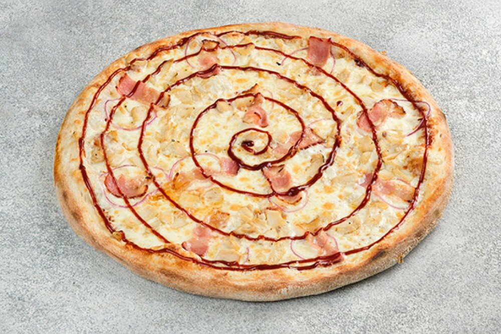Соус барбекю, сыр моцарелла, курочка, бекон, красный лук.