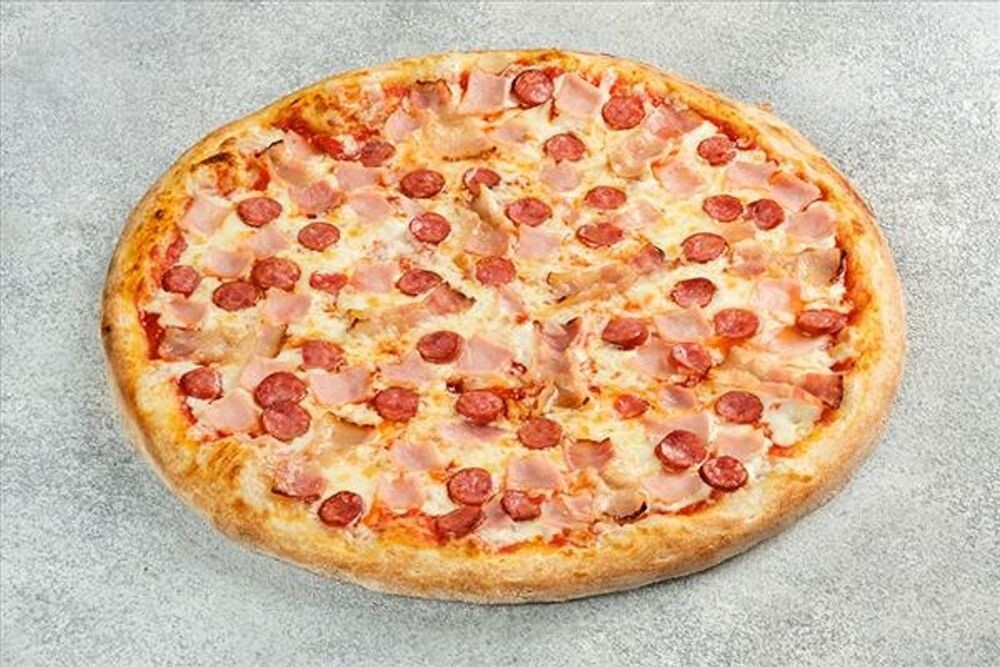 Соус на выбор, сыр моцарелла, ветчина, бекон, охотничьи колбаски (32 см)