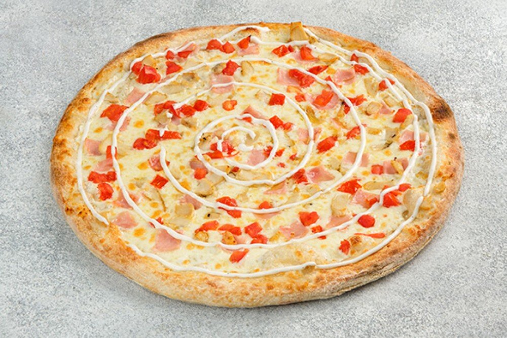 Соус ранч, сыр моцарелла, ветчина, курочка, томаты (32 см)