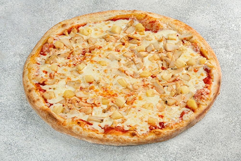 Соус на выбор, сыр моцарелла, курочка. ананас (32 см)
