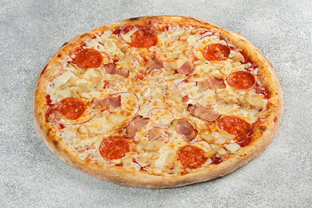 Соус на выбор, сыр моцарелла, курочка, бекон, красный лук, пеперони (32 см)