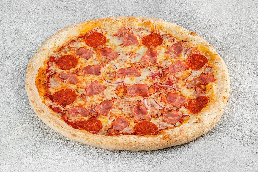 Соус на выбор, сыр моцарелла, бекон, красный лук, пеперони.