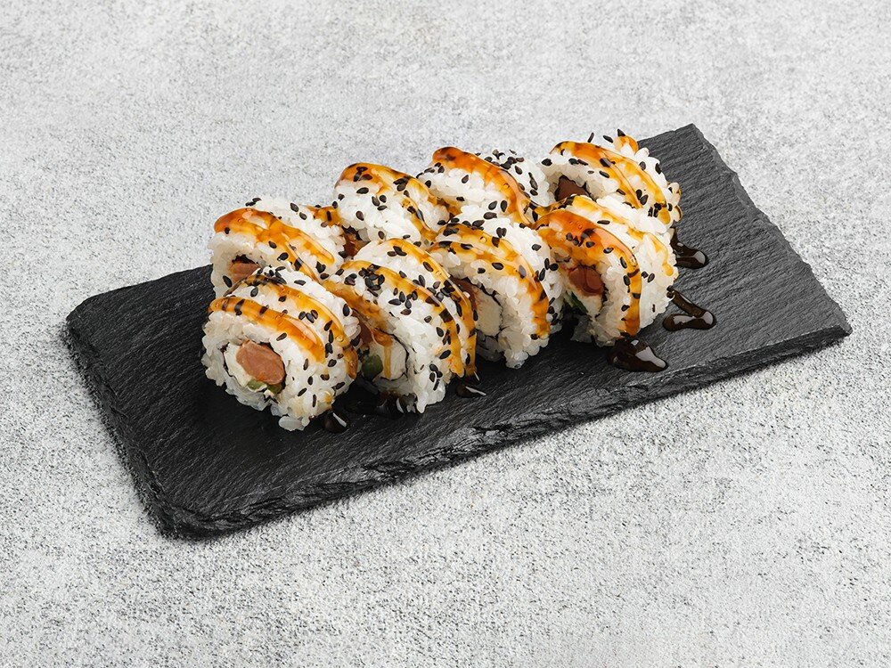 Рис, нори, семга, сыр творожный, огурчик, соус спайси, соус терияки, кунжут