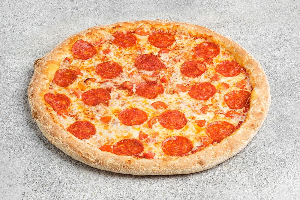 Соус на выбор, сыр моцарелла, колбаски пеперони, помидоры черри.