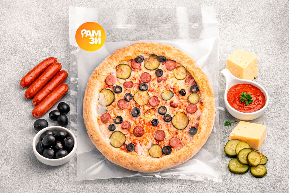 Готовая пицца шоковой заморозки. Разогрев в духовке до 180 градусов, получаете горячую пиццу с хрустящим бортом, как в кафе из печи! Соус томатный, сыр моцарелла, охотничьи колбаски, соленые огурчики, маслины.