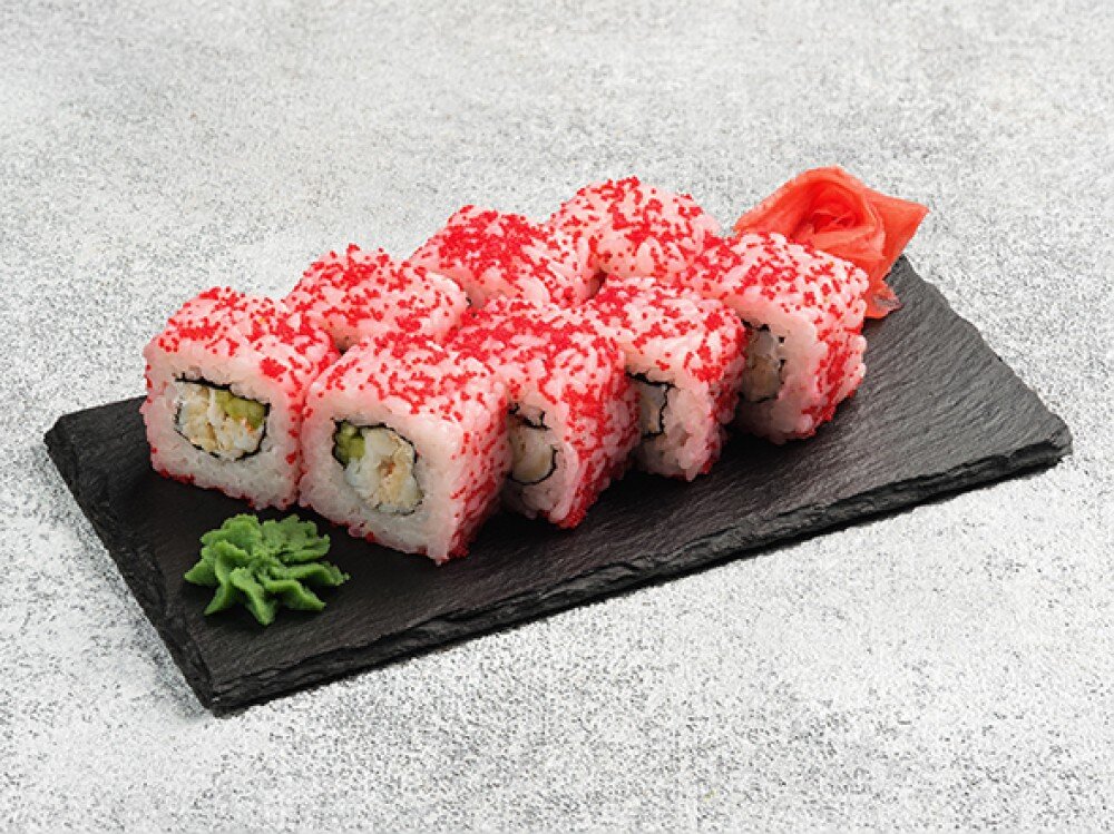 Рис, нори, имитация краба, майонез, огурчик, тобико