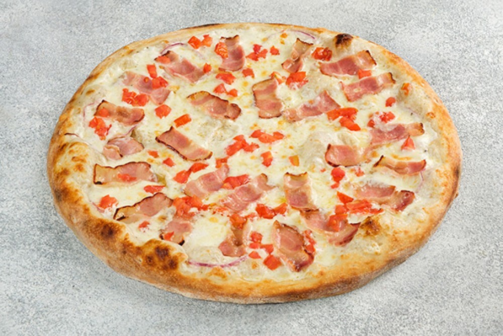 Сливочный соус, сыр моцарелла, бекон, томаты, красный лук, сыр пармезан (32 см)