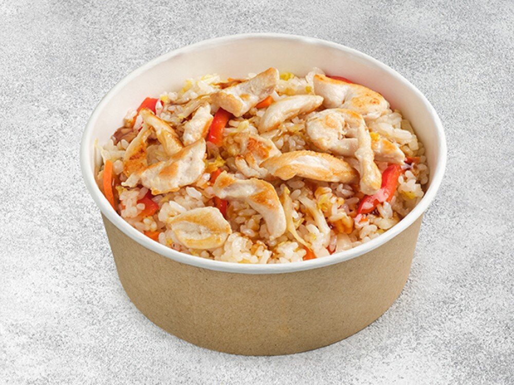 Рис, соус на выбор, пекинская капуста, сладкий перец, морковь, цукини, курочка
