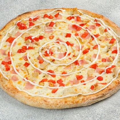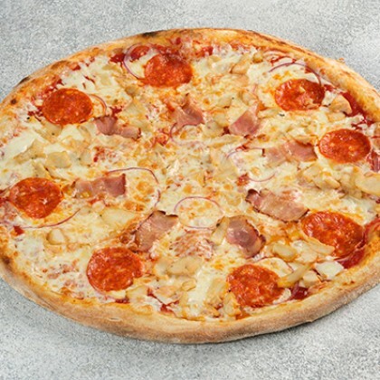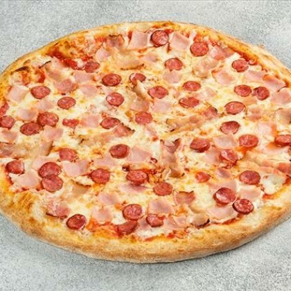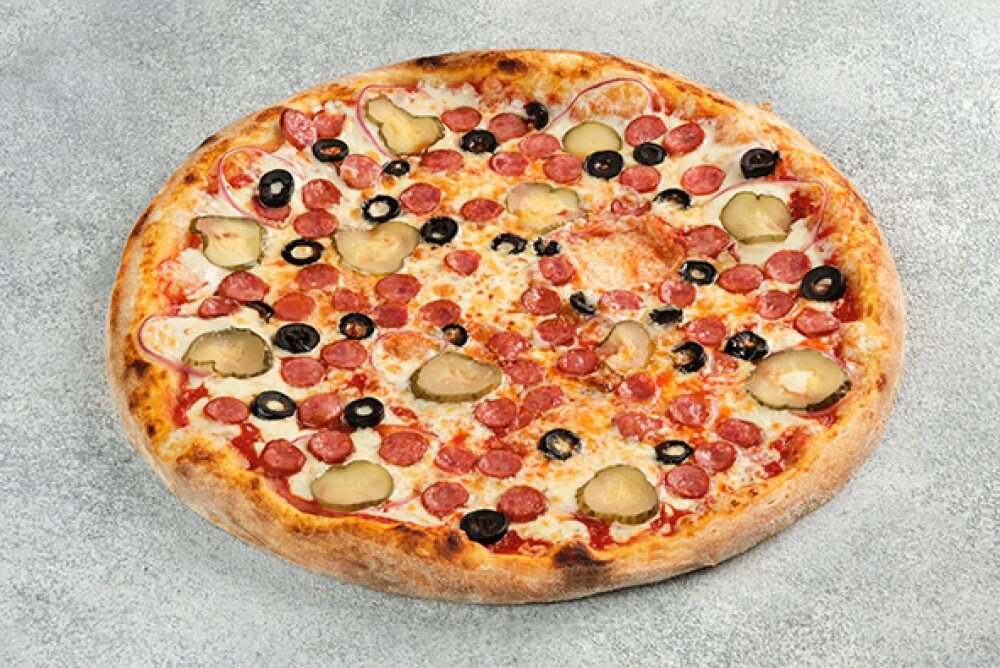 Соус на выбор, сыр моцарелла, охотничьи колбаски, соленые огурчики, маслины, красный лук (32 см)