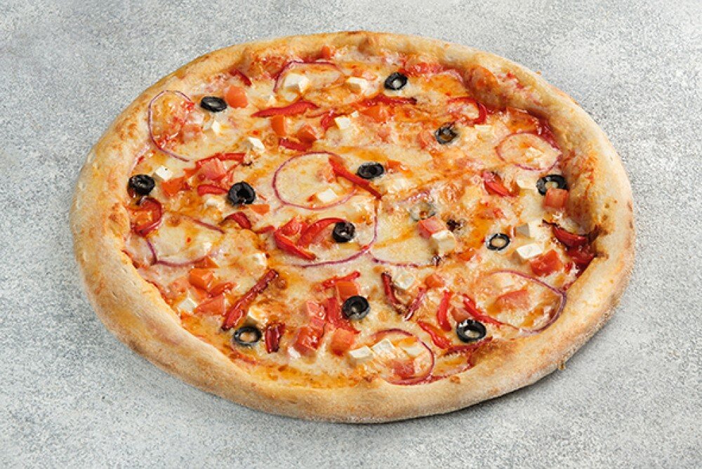 Соус на выбор, сыр моцарелла, болгарский перец, маслины, томаты черри, сыр фета, соус сладкий чилли (32 см)